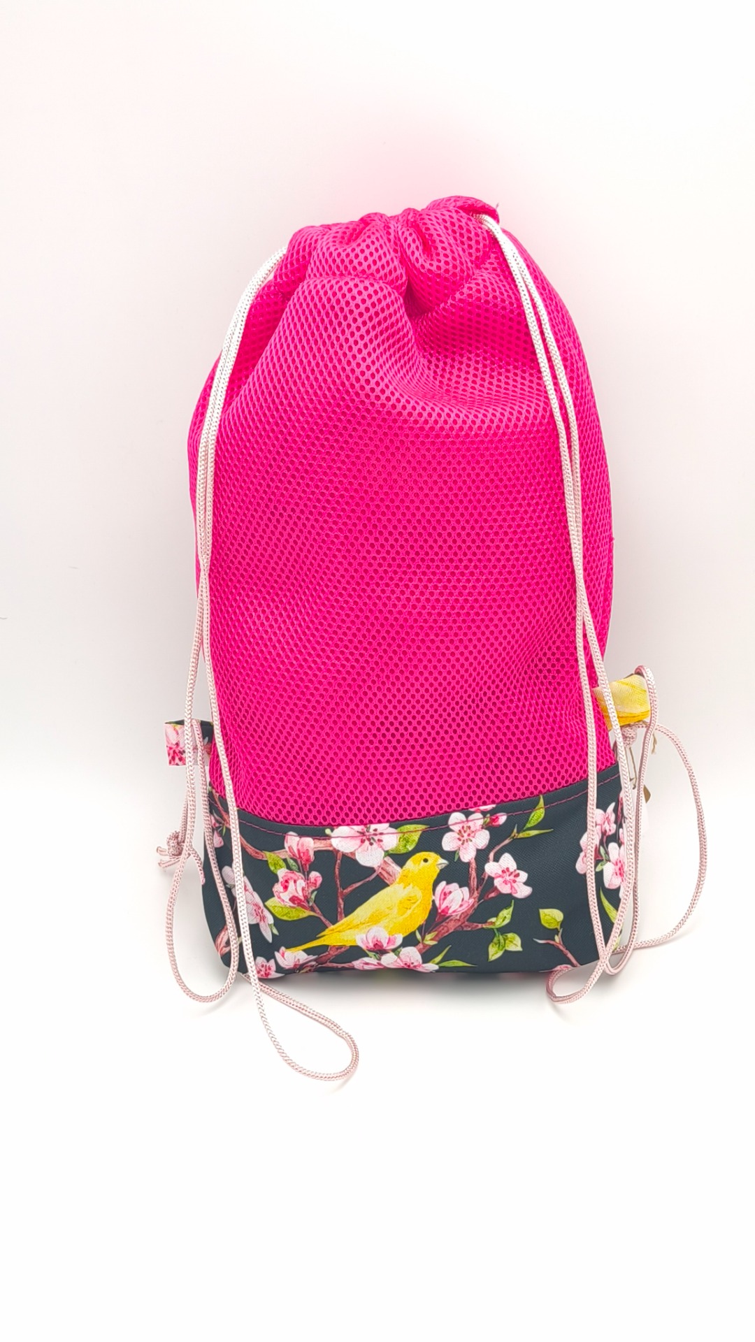Anyag: A táska felső része légáteresztő, pink színű hálós anyagból, az alsó rész pedig erős, mintás textilből készült.