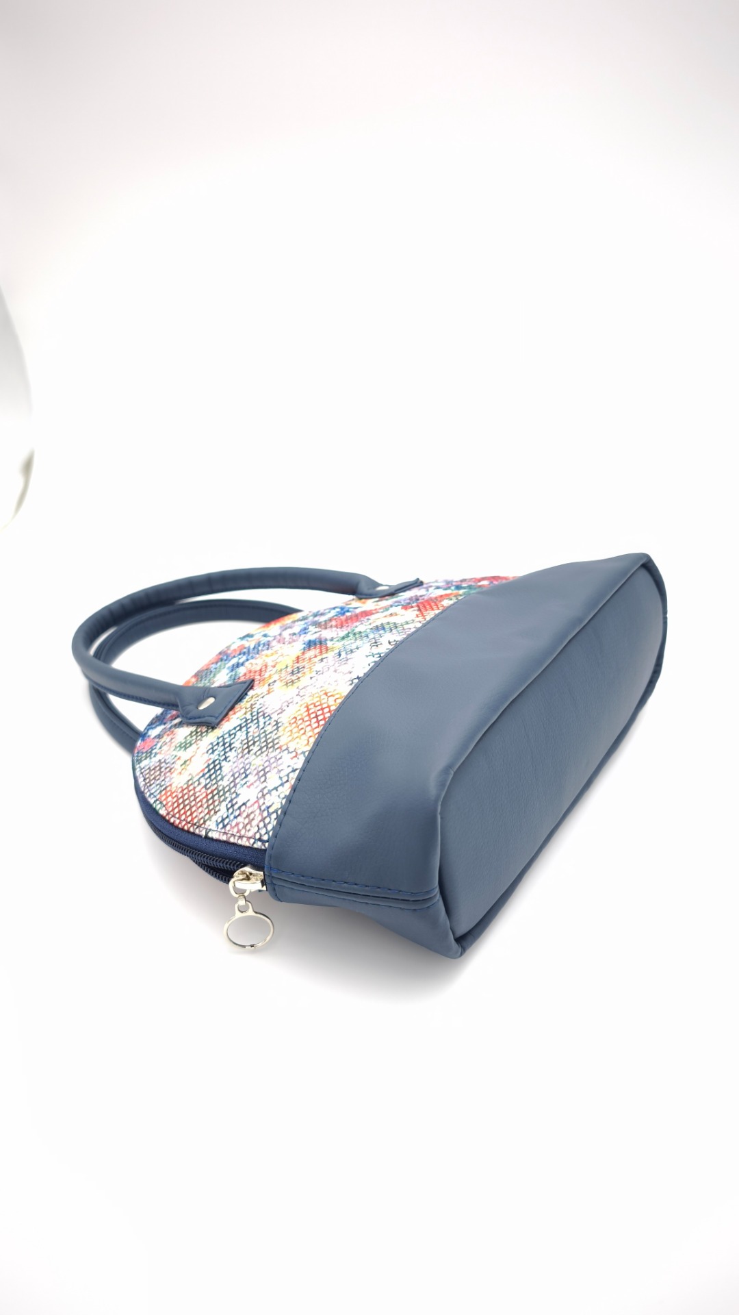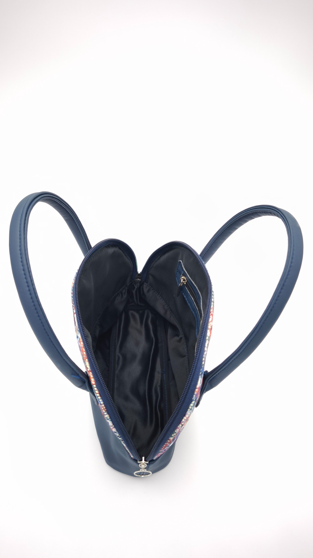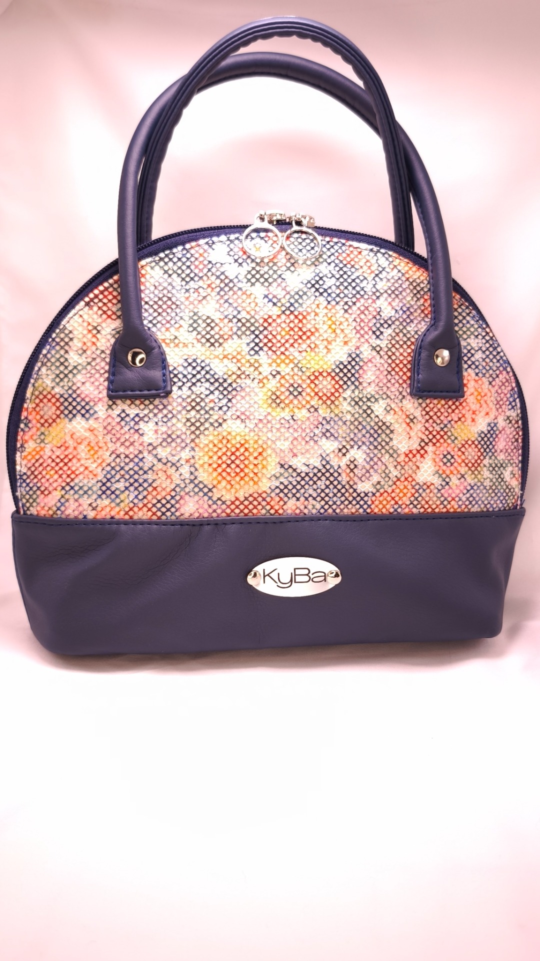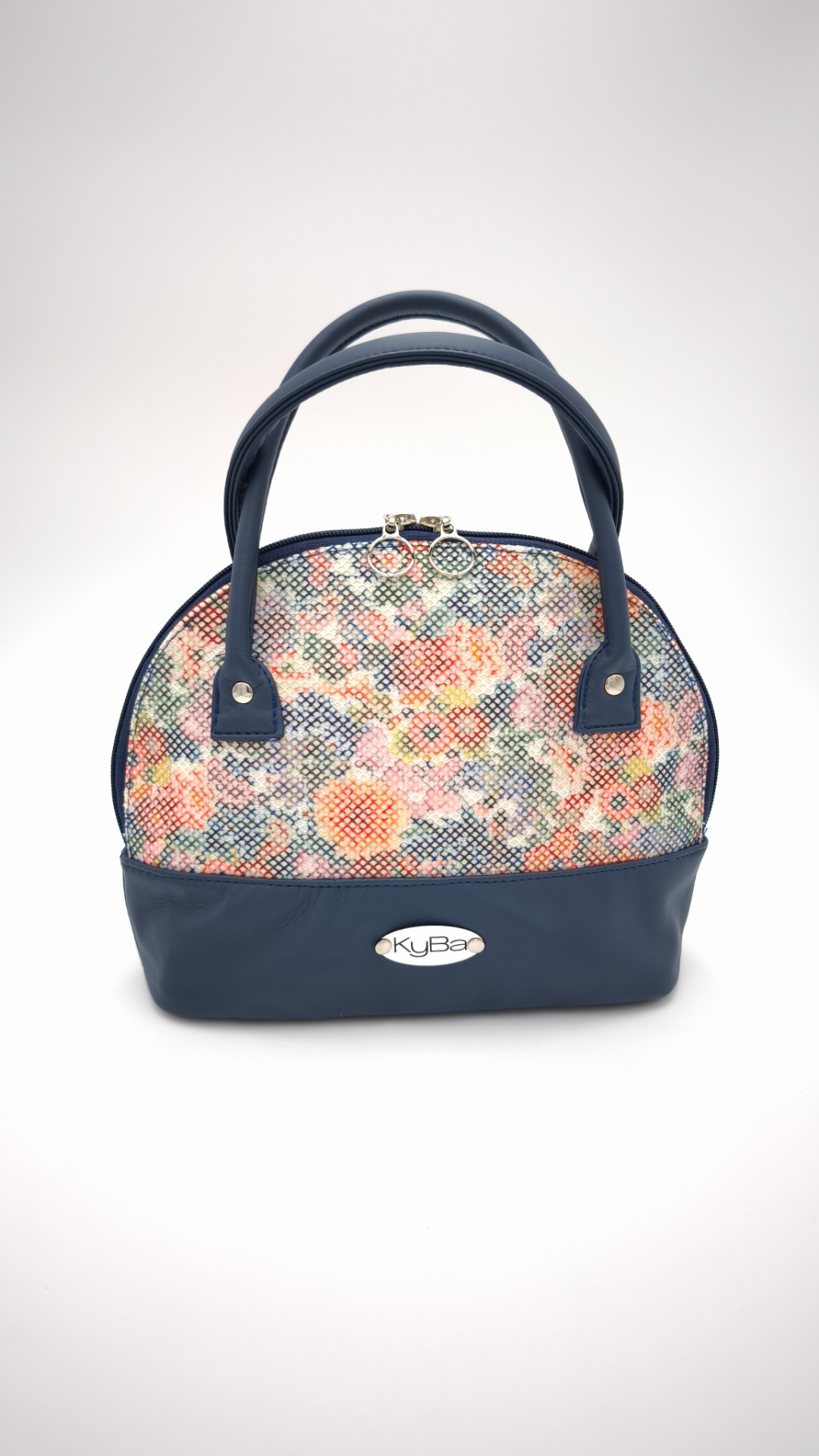 A KyBa virágmintás kézitáska tökéletes választás azok számára, akik a klasszikus formavilágot színes, egyedi dizájnnal szeretnék ötvözni. A félköríves felsőrész játékos virágmintával és hálós hatású textúrával díszített, amit mélykék alsó rész és fogantyúk egészítenek ki. A fém "KyBa" logó és a kör alakú cipzárhúzók elegáns, modern részletek, amelyek még különlegesebbé teszik ezt a darabot.